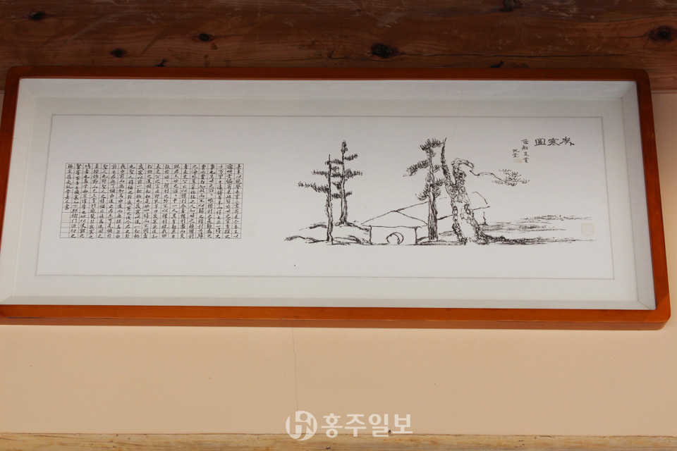 사랑채에는 온돌방이 세 칸 있고, 나머지는 대청과 마루가 있는데, 사랑채 마루 벽에는 추사의 대표작인 ‘세한도(歲寒圖, 국보 제80호, 국립중앙박물관 소장)’ 복제본이 걸려 있다. 겨울날 소박한 집 한 채 좌우로 소나무와 잣나무가 서 있는 그림이다. 그림에는 추사가 1840년부터 9년간 제주도에서 유배 생활을 할 때 사제의 의리를 지켜준 제자 이상적(李尙迪)에 대한 고마움이 담겨있다. ‘세한(歲寒)’은 논어(論語) 자한(子罕) 편의 ‘추운 계절이 된 뒤에야 소나무와 잣나무가 푸르게 남아있음을 안다(歲寒然後 知松柏之後凋)’에서 따온 것이다. 제자의 의리를 추위에도 푸른 나무에 비유한 것이다. 세한도에는 ‘오래도록 서로 잊지 말자’는 뜻의 ‘장무상망(長毋相忘)’이 새겨진 인장이 찍혀 있다.