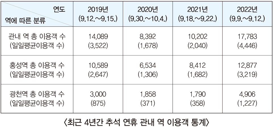 홍성군에 따르면 이번 추석 연휴 기간 동안 홍성역과 광천역을 이용한 인원이 일일평균 4446명에 달했다. 이는 코로나19로 사회적 거리두기를 추진했던 지난 2020년과 지난해 추석기간 동안 관내 역을 이용한 일일평균이용객에 비해 2배가 넘는 수치다.