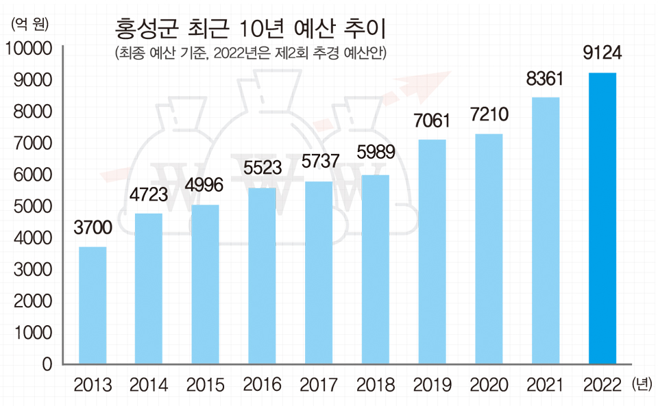 민선8기 홍성군에서 재정 1조 원 시대가 열릴 가능성이 커졌다. 군의 재정 규모는 최근 3년 동안 연평균 707억 원(9.2%)씩 증가했다. 군은 지금의 추세로 미루어 볼 때 다음해부터 재정 1조 원 시대가 열릴 것으로 전망하고 있다.