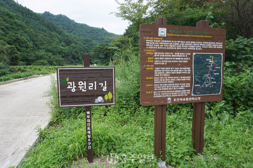 백두대간트레일 홍천구간은 산림유전자 보호구역이 있는 광원리길, 산새소리가 아름다운 새소리길, 고랭지 채소밭과 오래된 돌배나무가 있는 창촌리길, 채종포단지를 경유하는 자운리길, 태기왕의 전설이 깃든 불발령길 등 풍부한 역사와 문화의 이야기까지 경함할 수 있는 도보여행길이다. △제1구간(광원리길)은 월둔교~소한동 입구 5.32km(약 2시간 20분 소요), △제1-1구간(새소리길)은 원당초교 앞~소한동3교 6.3km(약 2시간 40분 소요), △제2구간(창촌리길)은 소한동 입구~논골 입구 15.53km(약 3시간 40분 소요), △제3구간(자운리길)은 논골 입구~수리재~원자분교(폐교) 앞 8.65km(약 3시간 소요), △제4구간(불발령길)은 원자분교(폐교)~불발령 입구 3.5km 또는 불발령 입구~불발령 정상 5km(약 2시간 50분 소요) 코스 등으로 구성됐다. 이번 백두대간트레일 홍천구간 도보여행길 취재는 홍천군 내면에 속하는 1-1구간인 원당초등학교~소한동3교 구간인 치유의 숲, 새소리길과 2구간인 창촌리길 구간에서 진행됐다.