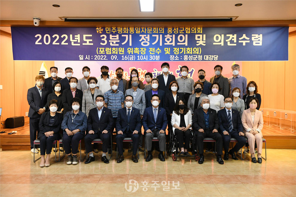 민주평화통일자문회의 홍성군협의회(회장 오석범)은 지난 16일 홍성군청 대강당에서 자문위원과 포럼회원 39명이 참석한 가운데 2022년도 3분기 정기회의를 개최해 통일 논의 선도를 위한 충남평화통일포럼회원들에게 위촉장을 수여했다.<사진>