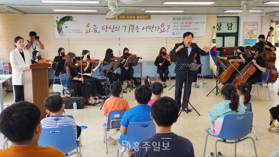 신당초등학교(교장 문제민)는 지난 21일 병설유치원아들과 전교생이 함께 홍성군립오케스트라의 ‘찾아가는 교과서 음악회’를 관람했다.<사진>