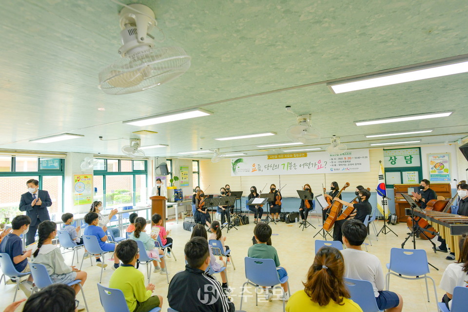 홍성군립오케스트라의 ‘찾아가는 교과서 음악회’가 전교생 31명의 학생이 참여한 가운데 지난 20일 서부면 신당초등학교에서 개최됐다.<사진>