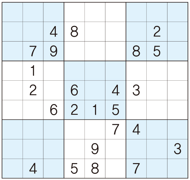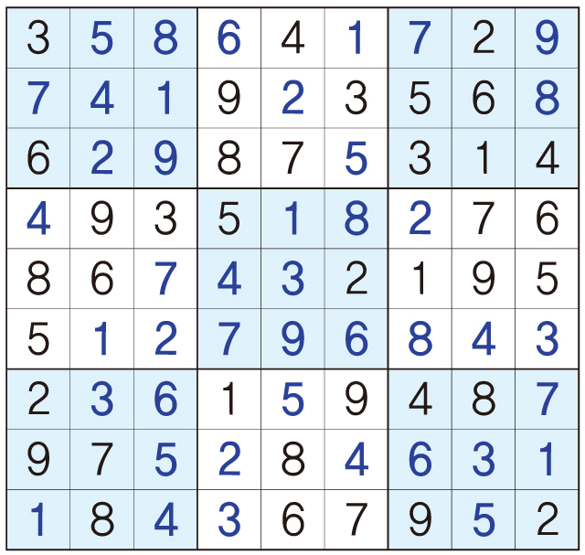 3. 큰 정사각형(9x9) 안에 있는 작은 정사각형(3x3) 안에는 숫자 1~9가 각 한 번씩 들어간다.