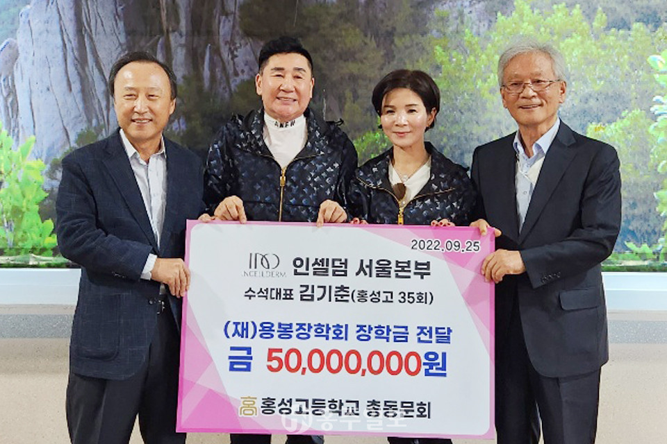 홍성 출신 기업인 김기춘(홍성고 35회) 인셀덤 서울본부 수석대표가 지난 25일 재단법인 용봉장학회(이사장 이한구)에 모교 후배들을 위한 장학금 5000만 원을 기탁했다.<사진>