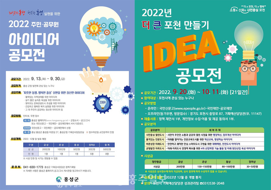 홍성군 기획감사담당관 정책기획팀 관계자는 “민선 8기가 새롭게 출범하며 정책목표가 변경돼 포괄적으로 아이디어를 받기 위해 공모전 주제를 넓게 설정했다”며 “공무원 머리에선 한계가 있기 때문에 주민들에게 수시로 아이디어를 받고 있다”고 말했다.