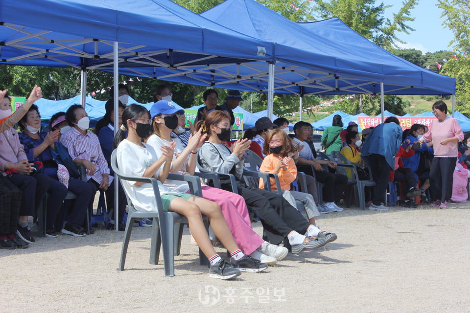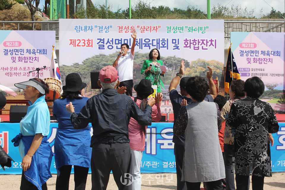 사회자의 권유로 무대에 오른 황선돈 결성면장은 노래를 부른 후 면민들과 함께 “힘내자 결성, 결성을 살리자, 결성면 화이팅”이라는 행사 슬로건을 구호로 외치며 결성면의 화합과 발전을 다짐했다.