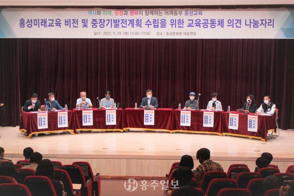 홍성교육지원청(교육장 주진익)이 지난 29일 관내 유·초·중·고 학생들과 학부모, 교직원, 지역민 등 150여 명이 참석한 가운데 홍성문화원에서 ‘홍성미래교육 비전 및 중장기발전계획 수립을 위한 교육공동체 의견 나눔자리(토론회)’를 개최했다.<사진>