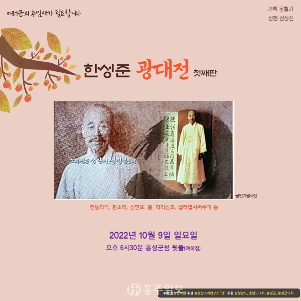 호적한 가을 저녁을 구성진 전통가락으로 채워줄 ‘한성준 광대전 첫째 판’이 오는 9일 오후 6시 30분에 홍성군청 여하정 일원에서 펼쳐진다.