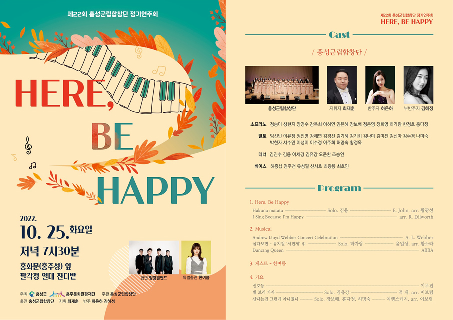홍성군립합창단(지휘자 최재훈)의 제22회 정기연주회 ‘Here, Be Happy(여기서 행복할 것)’가 오는 25일 오후 7시 30분 홍주읍성 홍화문 앞 팔각정 일대에서 개최된다. 이번 연주회는 지난 6월 충남도서관 야외연주회에 이어 군민들에게 가까이 다가가고자 다시 한 번 야외연주회로 진행된다.
