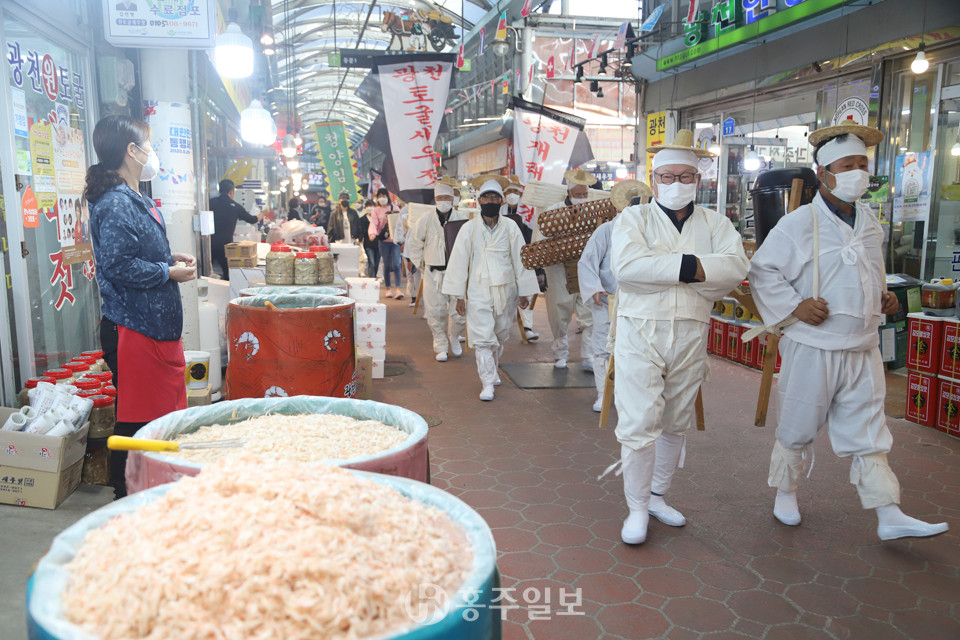 행렬에 참여한 한 주민은 “오랜만에 참여하게 된 행렬에 절로 흥이 난다”며 이마에 땀이 송글송글 맺힌 채 함박웃음을 지어 보였다. 사진은 지난 7일 광천전통시장 내 토굴새우젓 상회 앞을 지나가는 보부상·장꾼 행렬 모습.