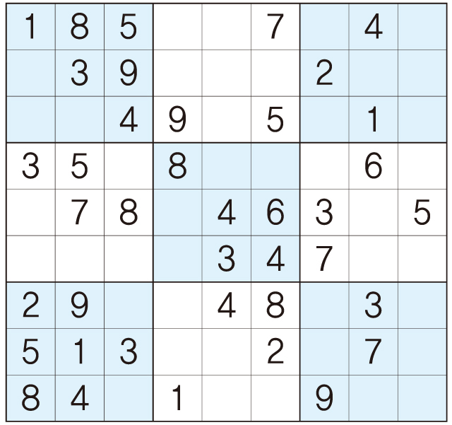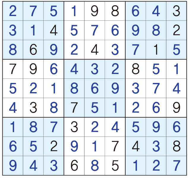 3. 큰 정사각형(9x9) 안에 있는 작은 정사각형(3x3) 안에는 숫자 1~9가 각 한 번씩 들어간다.