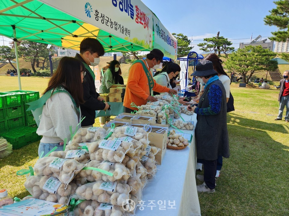 군 여하정 잔디밭에서 열린 홍보 행사에서는 홍성마늘과 더불어 빵 시식과 판매가 함께 진행돼 관람객으로부터 호응을 얻었다.
