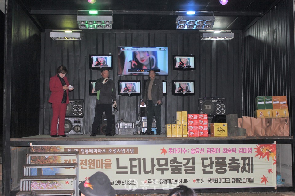 오후 6시 30분부터 진행된 정동 전원마을 느티나무 숲길 단풍축제에서는 김경아 등 초청가수들이 마련된 무대에 올라 공연을 펼쳤고 다과 시식행사도 동시에 진행됐다. 특히 캠프파이어와 함께 따뜻한 어묵탕이 제공돼 늦은 저녁까지 행사의 열기가 이어졌다.