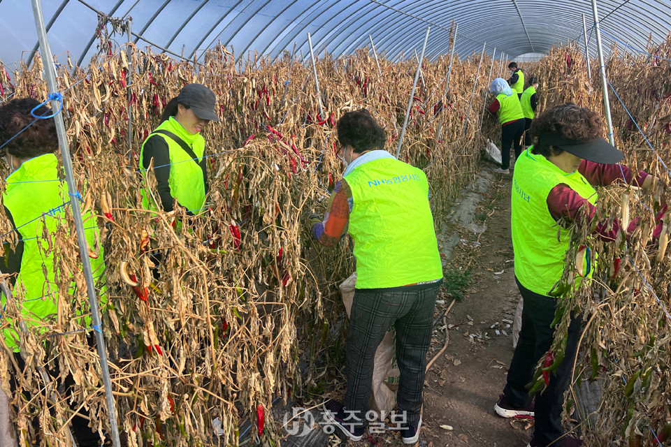 농협중앙회 홍성군지부(지부장 한만철)은 28일 수확기를 맞아 일손이 부족한 갈산면 가곡리에 거주하는 고추재배 농가를 찾아 농촌 일손돕기를 실시했다.<사진>