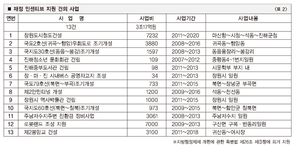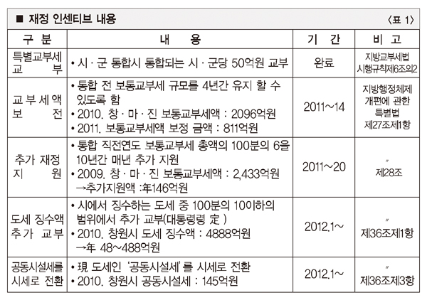 ▲2010년, 통합 결실 인센티브는 △창원· 마산· 진해 지역사업에 각각 50억 원씩 150억 원 지원 △통합 시점 행정 인프라 구축 및 주민 불편사항 해소 ▲2011년 통합을 발판으로 지역발전 투자 본격화를 위해 △보통교부세 811억 원 보정 △통합시 추가 재정지원 146억 원 (정부예산에 광특회계 보조금 73억 원 편성, 나머지 73억 원 지원방안 정부 부처 간 협의 중) △국고보조율 10%p 상향 조정(52억원) △대도시 사무특례 이양에 따른 도세 추가지원 협의 중(도세 징수액 100분의 10이하 범위 추가교부(년 48~488억 원), 지역자원시설세 시세 전환(2012년 145억 원) <표 2>