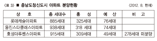 도청신도시 아파트건설 분양으로 인한 홍성지역, 예산지역 분양 계약한 내용을 살펴보면 <표 3>에서 같이 홍성군민 953세대 약 2300여명의 인구가 도청신도시로 홍성지역 인구가 흡수될 것이라는 전망을 내놓고 있다.