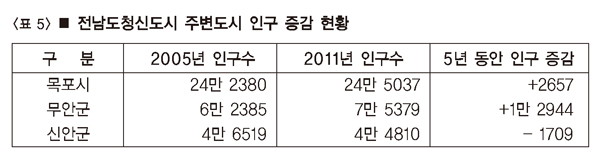 지난 2005년 전남도청이전지역인 전남 무안군, 남악신도시의 경우 목포시와 경계에 도청신도시가 건설됨으로써 삼향면이 읍으로 승격되고, 표에서 보는 것 같이 주변도시인 농촌은 정체 내지 감소하고 있는 것은 도청이전 신도시의 영향으로 공동화 현상이 발생하고 있는 것이다.<표 5>