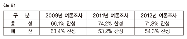 홍성군의회는 지난 2009년부터 특별위원회와 상생발전연구회를 운영해 오고 있다. 홍성과 예산군의 주민여론 수렴을 위해 토론회와 세미나를 개최했고, 주민 여론조사를 실시했다. 공감대 형성의 한 과정인 셈이다. 지난2009년, 2011년, 2012년 4년 동안 홍성· 예산통합에 대한 군민의 ‘찬성’한다는 여론의 변화를 보면 <표 6>과 같이 도청신도시에 아파트 분양과 2013년 1월 충남도청이 이전됨에 따라 홍성·예산 군민들은 도청신도시의 영향으로 통합의 공감대가 형성되어가고 있다는 여론의 추이를 알 수 있다. 실제로 통합에 대한 공감대가 형성되고 통합의 필요성을 홍보한다면 주민자율에 의한 통합이 가능할 것이라는 여론의 추이를 짐작할 수 있는 대목이다.