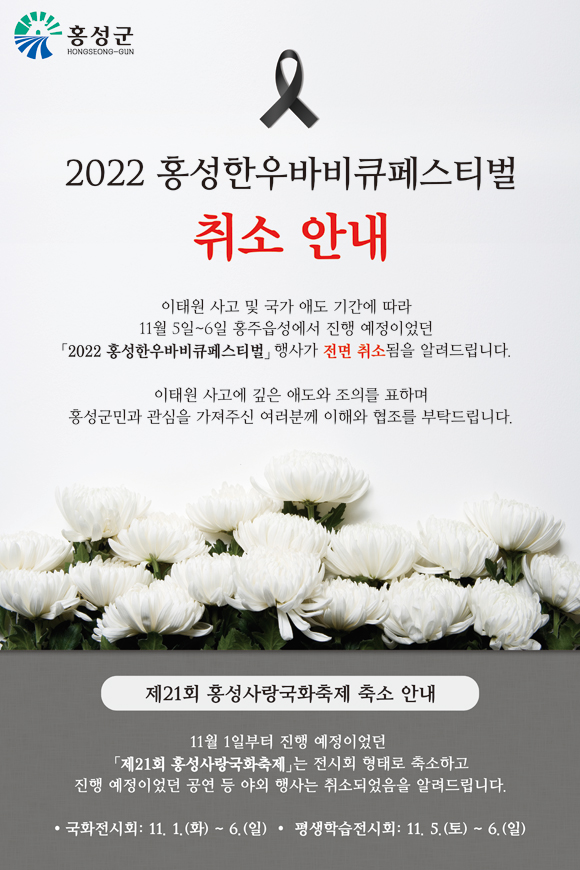 정부가 지난달 30일부터 오는 5일까지를 서울 이태원 참사 사망자를 애도하는 국가애도기간으로 선포했다. 홍성군은 오는 5일 홍주읍성 일원에서 개최 예정이던 2022 홍성한우바비큐페스티벌(이하 바비큐페스티벌)을 취소한다고 지난달 31일 밝혔다.