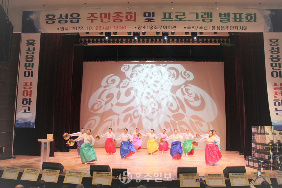 홍성읍주민자치회(회장 김종만)가 주최·주관한 ‘2022 홍성읍 주민총회 및 프로그램 발표회’가 지난달 28일 홍주문화회관에서 열렸다. 오후 1시 무렵 시작된 이날 행사는 식전공연에 이어 1부 의식행사, 2부 주민총회, 3부 프로그램 발표회, 주민총회 결과발표·폐회 순으로 진행됐다.<사진>