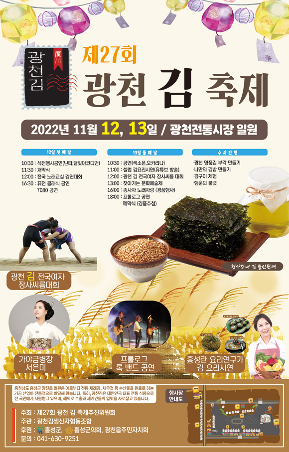 행사 당일은 김 할인판매를 비롯해 나만의 김밥 만들기, 김구이 체험, 전국 여자 장사씨름 대회, 요리연구가 홍성란 씨의 요리 시연 등 다양한 프로그램이 함께 진행된다. 광천김은 홍성군 대표 특산물로 서해 청정바다의 1등 원료를 사용해 맛뿐만 아니라 풍부한 식이섬유와 각종 비타민 미네랄을 포함해 소비자들에게 인기가 많은 상품이다.