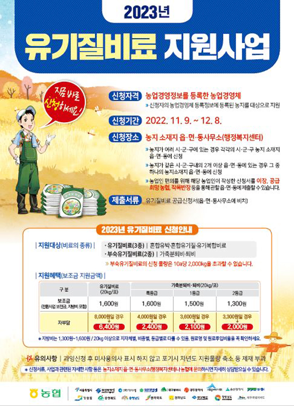 홍성군이 환경친화적 자연순환 농업 정착과 고품질 안전농산물 생산 유도를 위해 추진하는 2023년 유기질비료 지원사업을 지난 9일부터 다음 달 8일까지 접수한다고 밝혔다.