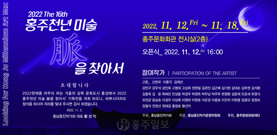 충남중진작가회가 주최하고 충남중진작가운영위원회가 주관, 홍주문화관광재단이 후원한 한 이번 전시회는 올 해로 16회째이며, 오픈식은 오는 12일 오후 4시 진행될 예정이다.