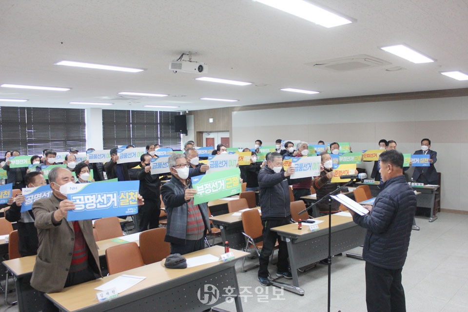 홍성농협은 지난달 24일 3층 대회의실에서 열린 ‘2022 제4차 임시총회’에서 충남선거관리위원회의 선거 교육을 이수하고 제3회 전국동시조합장선거에서 공정한 선거를 실시할 것을 다짐했다.