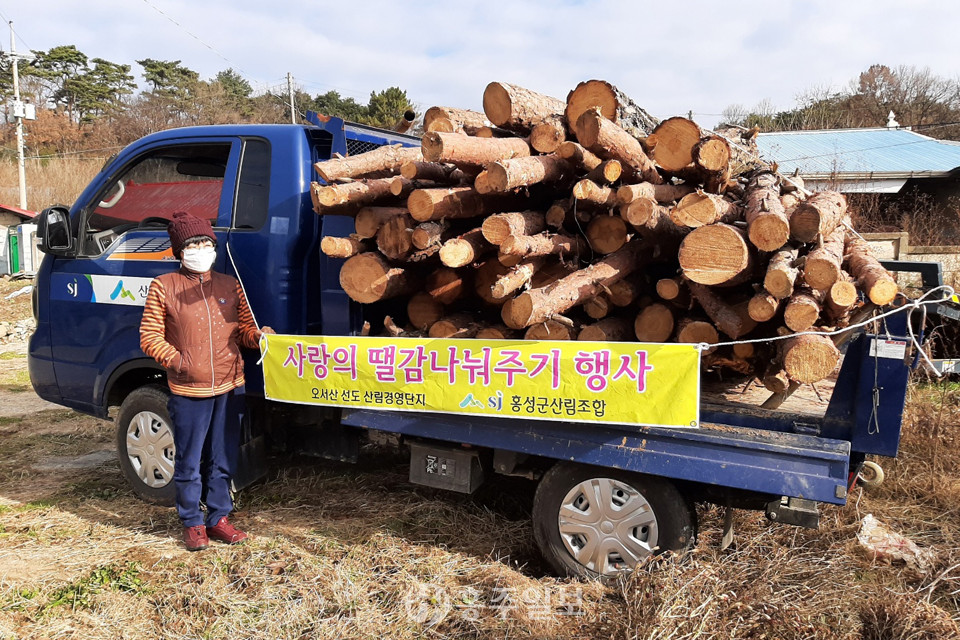 홍성군산림조합(조합장 윤주선)은 지난 2일 오서산 선도 산림경영단지 숲 가꾸기 사업의 일환으로 원목과 부산물을 수집해 선도단지 내 어려운 이웃들이 따뜻한 겨울을 보낼 수 있도록 사랑의 땔감 나눠주기 행사를 가졌다.<사진>