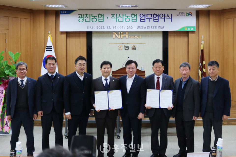 광천농업협동조합(조합장 이보형)은 지난 14일 광천농협 회의실에서 천안 직산농업협동조합(조합장 민병억)과 업무협약(MOU)을 체결했다.<사진>