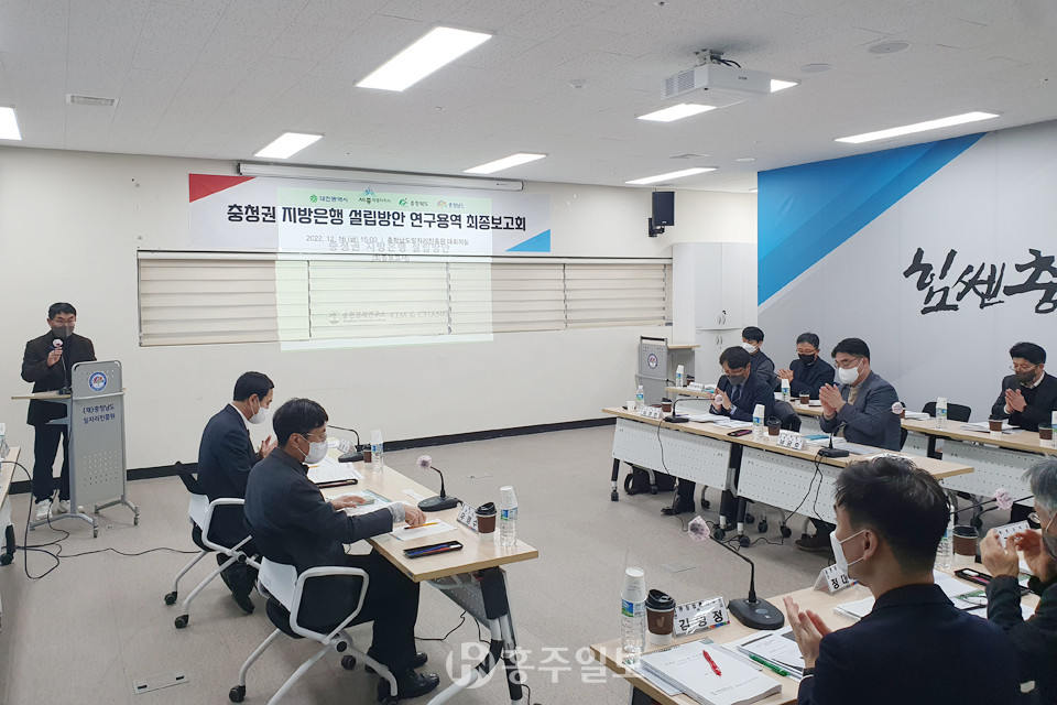 도는 16일 내포신도시 충남일자리진흥원 대회의실에서 ‘충청권 지방은행 설립 방안 연구용역 최종보고회’를 개최했다.<사진> 이번 연구용역은 충청권 지방은행 설립 당위성 확보와 실질적인 은행 설립 방안 마련을 위해 충청권 4개 광역자치단체가 지난 6월부터 공동 추진해왔다.