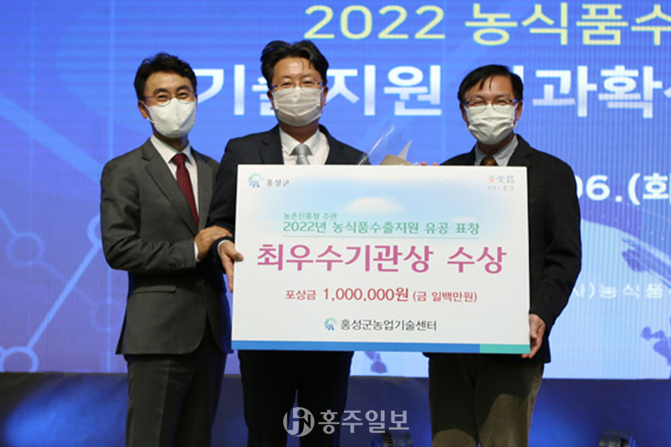 홍성군농업기술센터(소장 이승복)가 지난 6일 수출경영체 우수사례 발굴, 수출연구개발, 보급기술의 대내외 공유·확산을 위해 농촌진흥청에서 개최한 ‘2022년 농식품수출기술지원 성과확산대회’에서 농촌진흥청장 표창을 수상했다.