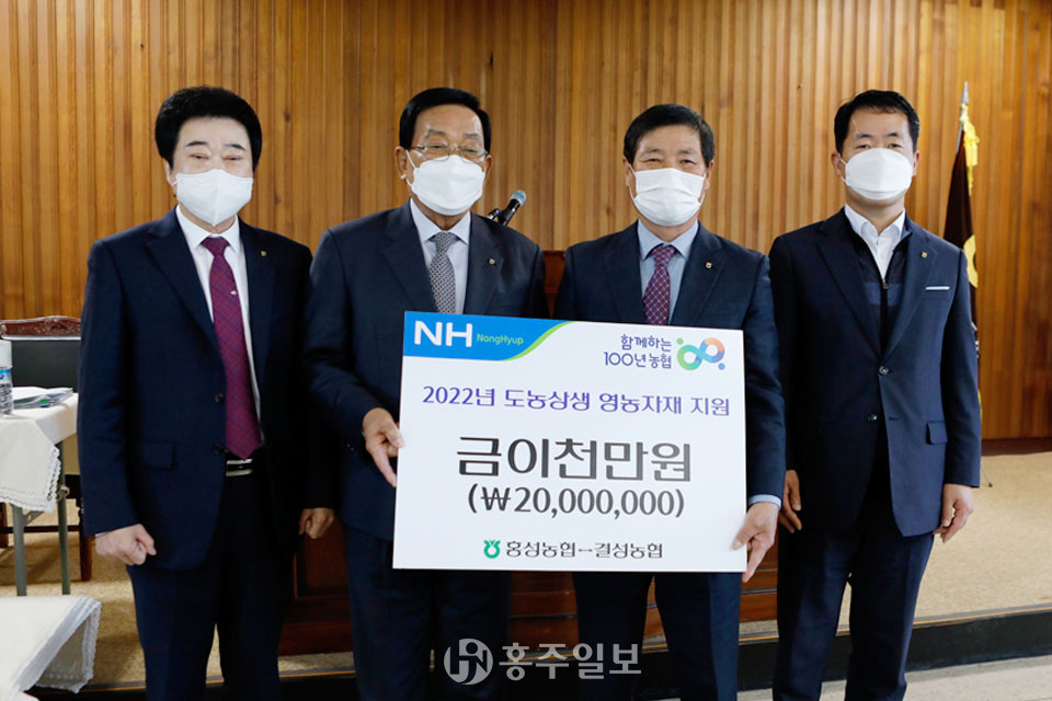 홍성농업협동조합(조합장 정해명)은 지난달 30일 결성농협 2층 회의실에서 양 농협 임직원과 대의원이 참석한 가운데 결성농협에 도농상생자금 2000만 원을 전달했다. 결성농협은 지원받은 자금으로 농업인 실익증진을 위한 사업을 통해 도시농협과 농촌농협의 균형 발전을 도모하기로 했다.