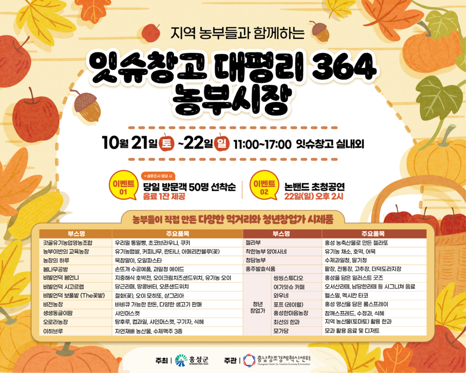 홍성군이 주최하고 충남창조경제혁신센터가 주관을 맡아 열리는 이번 ‘대평리 364 농부시장’은 소비자와 농민, 청년창업자가 직접 만나는 농산물 직거래 행사로, 홍성잇슈창고(광천읍 홍남동로 121) 실외 마당에서 열린다.
