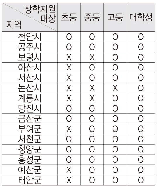 충남 15개 시군의 장학사업을 보면 초등학교 미지원수는 8개 시·군, 중학교 3개 시·군이 미지원하고 있다. 아직 충남의 장학사업에서 초등학생은 미지원이 반이 넘어가지만, 중학생은 여전히 지원하는 지역이 많다. 초등학교와 중학생의 지원에 대한 논란은 여전히 진행될 것으로 보인다. 또한 학자금 무이자 대출서비스에 더해 장학금 지원 명목을 다양하게 늘리는 것도 중요하다. 아산시가 좋은 사례라 할 수 있다.