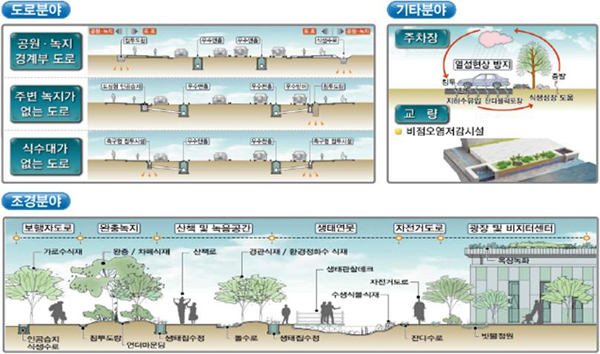 특히 녹지가 있는 도로부분의 처리, 단독주택지의 처리 시스템이 도입되면 기존 도시(5~10%) 3배 이상의 침투 · 저류를 통해 물순환 환경이 복원되고, 물순환 환경의 복원으로 빗물유출량 저감·증발산량 증가를 통한 도심 열섬현상 완화·비점오염원 제어 및 하천 건천화 방지 등 개선 효과가 클 것으로 기대된다.