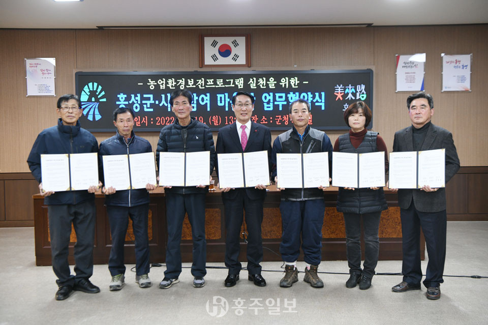 유기농업특구 홍성군은 2022년 4월 선정된 농업환경보전프로그램 신규 참여마을과 올해 수립한 농업환경보전 실천 계획을 성실히 이행하기 위해 상호 협조하고자 지난 19일 협약식을 개최했다.<사진>