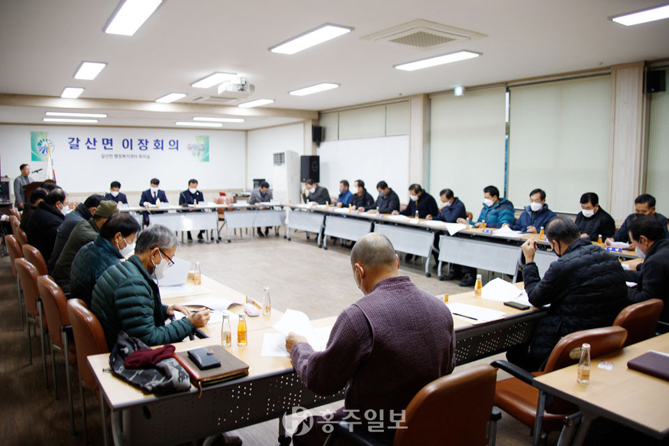 ‘12월 중 갈산면 이장회의’가 지난 26일 오후 5시 갈산면행정복지센터 2층 회의실에서 열렸다.<사진> 이 날 회의에는 갈산면 이장단들은 물론 이종학 충남도의원, 이선균 군의회 의장, 김덕배 군의원 등도 자리에 함께했다.