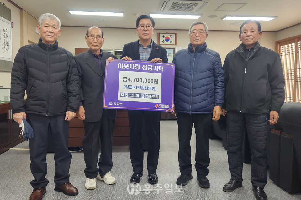 대한노인회 홍성읍분회는 홍성군지회 산하 단체로 홍성읍 57개 경로당을 지도 관리하고 있으며 해마다 각 경로당 어르신들의 귀한 성금을 모아 기탁하여 평소 나눔문화 확산에 힘써왔다.