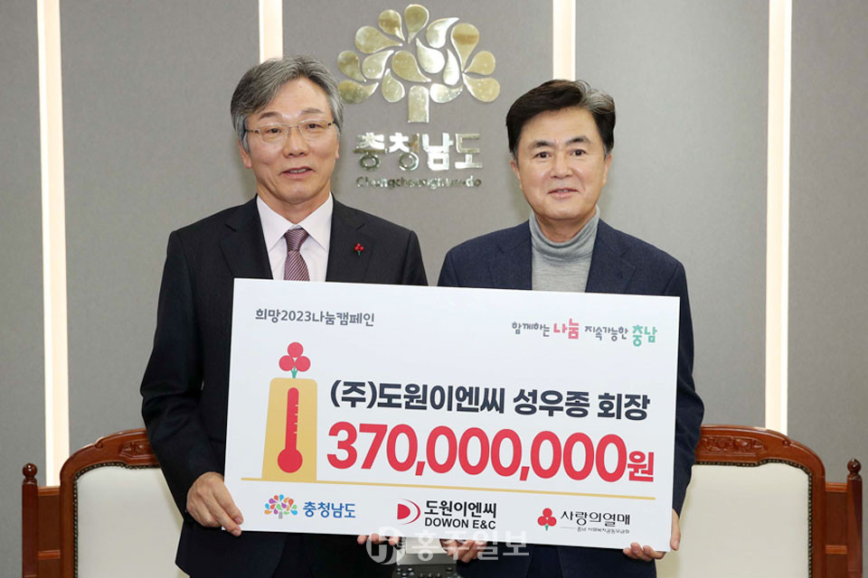 충남도는 21일 ㈜도원이엔씨 성우종 대표로부터 이웃돕기 성금 3억 7000만 원을 전달받았다.<사진>