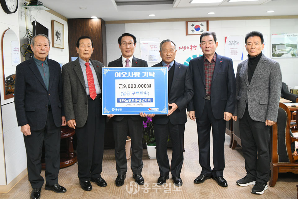대한노인회 홍성군지회(지회장 조화원)는 지난해 12월 29일 홍성군청 군수실에서 연말 불우한 이웃을 위해 사용해달라며 이웃돕기성금 900만 원을 기탁했다.<사진>