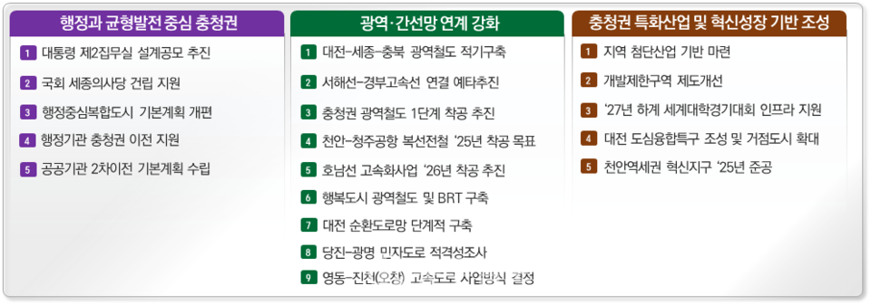 국토교통부는 충남권에 대한 약속으로 △서해선과 경부고속선 연결사업은 올해 예비타당성조사가 추진 노력 △신탄진과 계룡을 연결하는 충청권 광역철도 1단계 사업은 올해 착공을 목표 △천안-청주공항 복선전철은 2025년 상반기 착공을 목표 △당진-광명 민자 고속도로는 적격성 조사 결과에 따라 사업자선정 등 후속절차 신속·추진 등을 들었다.
