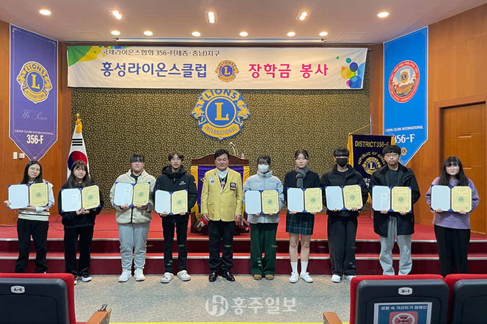 홍성라이온스클럽(회장 임성환)이 지난 7일 국제라이온스협회 356-F지구 클럽회관 2층 대회의실에서 관내 중·고등학교 추천 우수 장학생 10명에게 30만 원씩 총 300만 원의 장학금을 전달했다. 한편 홍성라이온스클럽은 주거환경 개선, 연탄 나눔, 장애인 휠체어 등반대회, 이웃돕기 봉사 등 관내 소외된 이웃들을 위한 다양한 활동을 펼치고 있다.