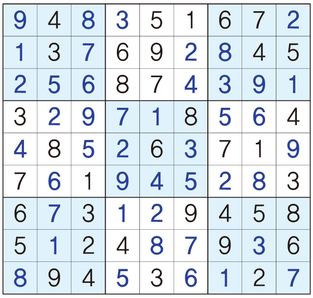 3. 큰 정사각형(9x9) 안에 있는 작은 정사각형(3x3) 안에는 숫자 1~9가 각 한 번씩 들어간다.