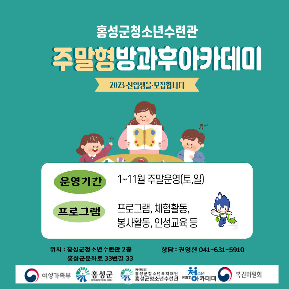자세한 사항은 홍성군청소년수련관 주말형방과후아카데미 담당(631-5910)으로 문의하면 알 수 있다.