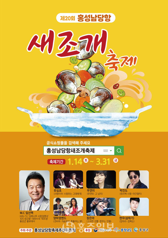 홍성군 대표 먹거리 ‘새조개’를 제철에 맛볼 수 있는 ‘제20회 홍성남당항 새조개축제’가 오는 14일부터 31일까지 서부면 남당항 축제공원 일원에서 열린다.