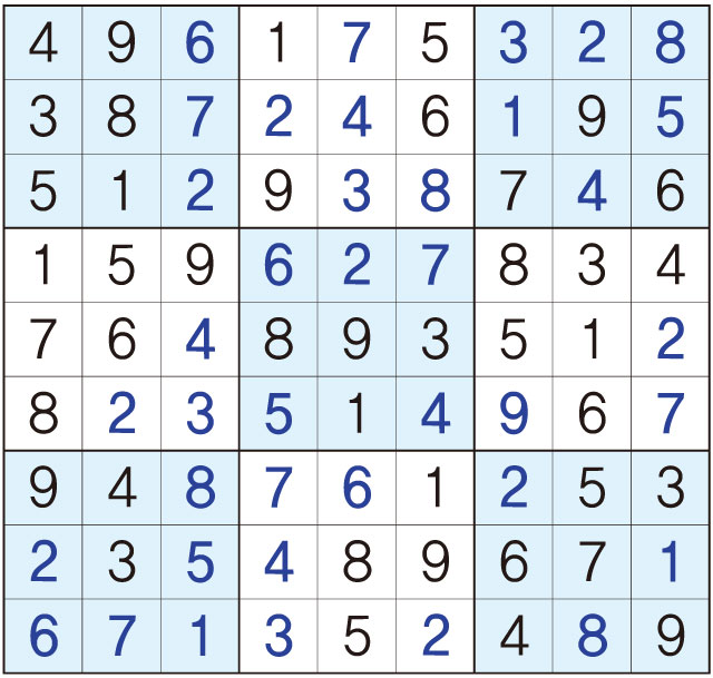 3. 큰 정사각형(9x9) 안에 있는 작은 정사각형(3x3) 안에는 숫자 1~9가 각 한 번씩 들어간다.