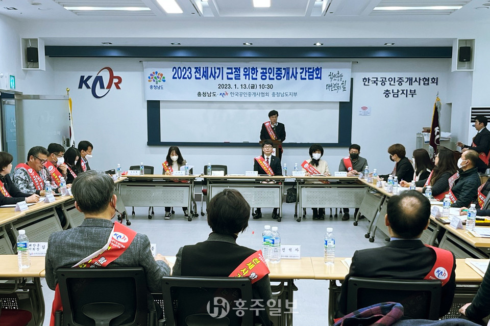 충남도는 13일 아산에 있는 한국공인중개사협회 충남지부 사무실에서 전세 사기 근절 및 안전한 부동산시장 조성을 위한 ‘2023 공인중개사 관계자 간담회’를 개최했다.<사진>