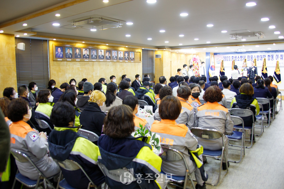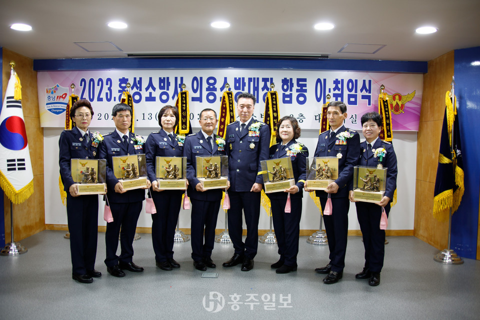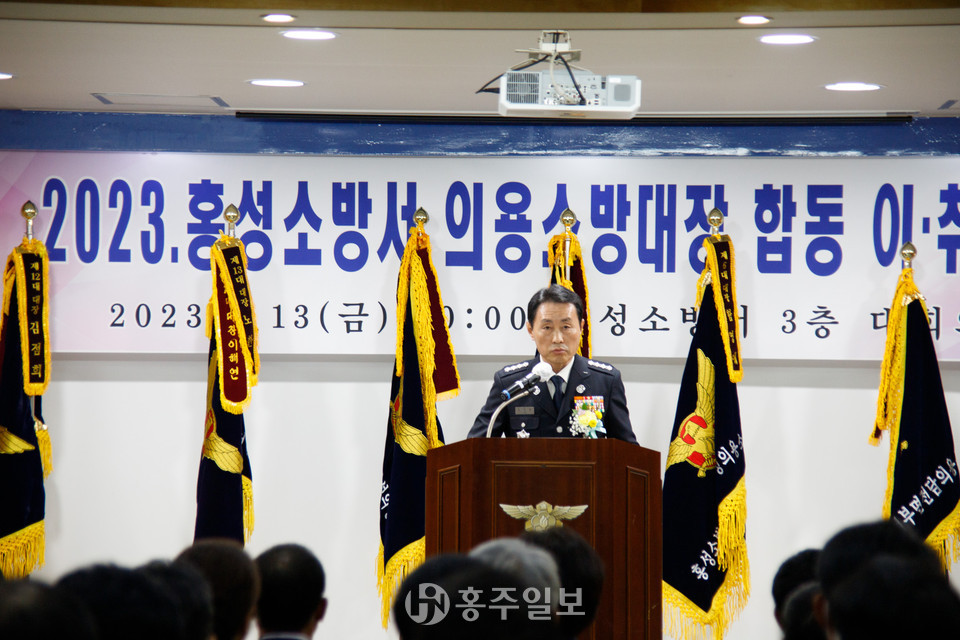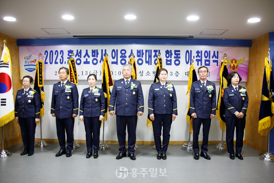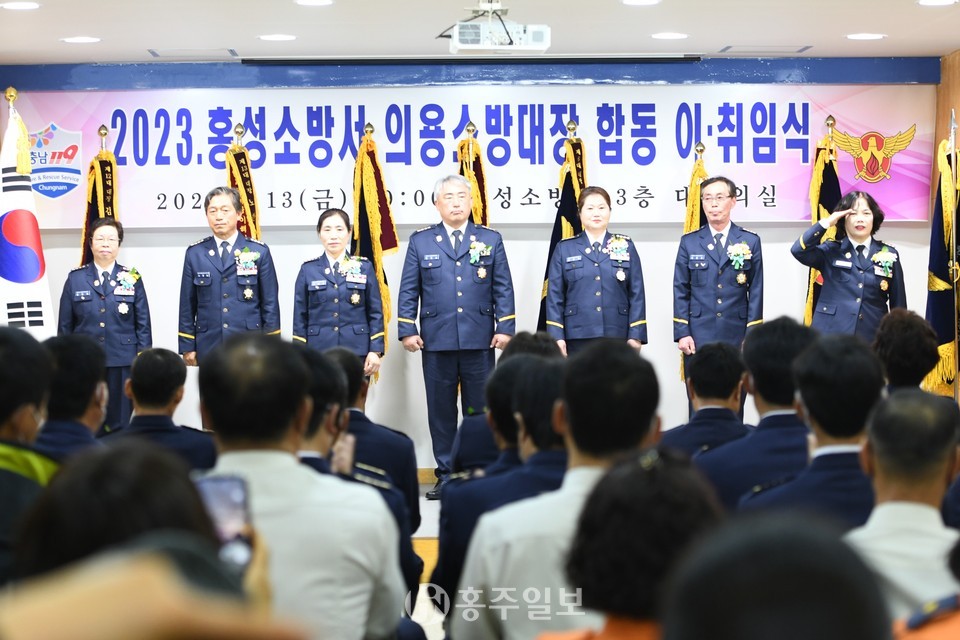 새로 임명된 다섯 의용소방대의 대장 이·취임식이 합동으로 진행됐다. 13일 홍성소방서 3층 대회의실에서 관계자 등 100여 명이 함께한 다운데 ‘2023년 상반기 의용소방대장 합동 이취임식’이 열렸다.